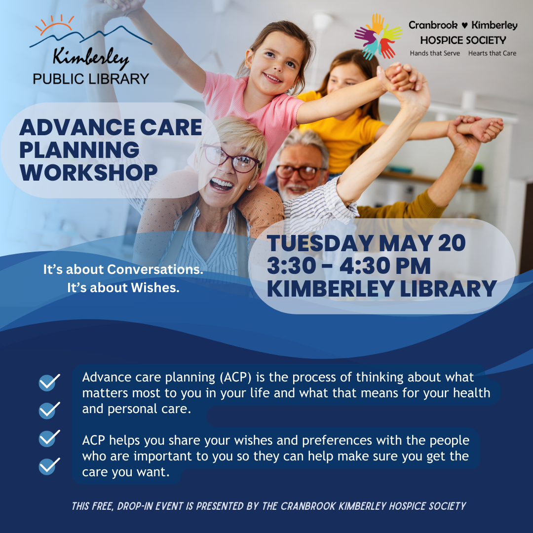 May 20, 2026 @ 3:30 pm - 4:30 pm Advance Care Planning Workshop Kimberley Public Library 115 Spokane Street, Kimberley, BRITISH COLUMBIA, Canada